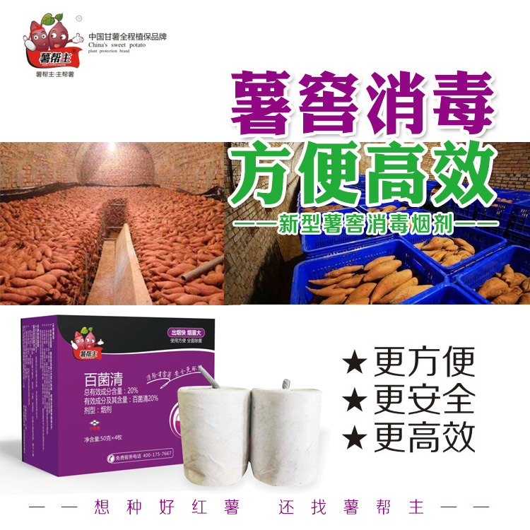 可用20%的百菌清烟剂50克,每20平方米左右放一个,对薯窖进行灭菌消毒处理,相对于传统的硫磺消毒方法,这个方法使用更方便,灭菌更广泛。